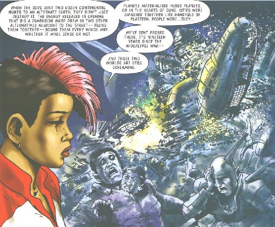 Usual Designator: None. Also known as: N.A. Multiverse: Judge Dredd Significant locals: None Significant locations: None Visited by: Mega-City One's TADs. Local travellers: None First appeared: The Apocalypse War, Judge Dredd, 2000 A.D. Prog 250 History: A peaceful and idyllic Earth that had enjoyed 1000 years of total peace. It was totally destroyed during the Apocalypse War when East-Meg One's Apocalypse Shield diverted Mega-City One's Total Annihilation Devices to it. The destruction of this world opened a dimension warp that dragged two alternate realities adjacent to it together, merging them in insane ways. Comments: Created by John Wagner and Alan Grant.