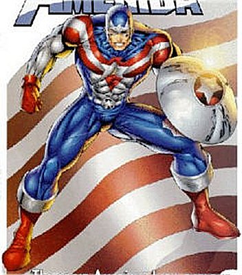 Note the star in Agent America's shield, just like Cap's. Note the star on his chest, not yet surrounded by the circle present in all versions of Fighting American. Note that both Agent America and Liefeld's Fighting American have white sleeves, like Cap but unlike other incarnations of Fighting American. Ditto the boots and the trunks. Even the lettering (which you can see a bit of) above Agent America uses Cap's distinctive red, white and blue version of the word America. We haven't even gone into the sidekick and villain similarities. Not really surprised Marvel weren't amused.