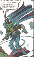 Powers/Abilities: Craig transforms into the Blue Wizard whenever any one of the group says or even writes the phrase Rings of Zorr. Blue Wizard has a magical cane, which grants him a variety of abilities, such as transforming Oakman into a butterfly, creating a floating TV screen out of thin air, checking a hoard of robot duplicates for a heart beat to identify the one living person amongst them, allowing himself and his teammates to survive in space without any other equipment, and so on. Unlike his two teammates, he can't fly, so he usually creates a small flying platform to stand on. In Zenith we also see him cast illusions, fire energy bolts, levitate / fly, and cause a tree to grow up through an opponent.