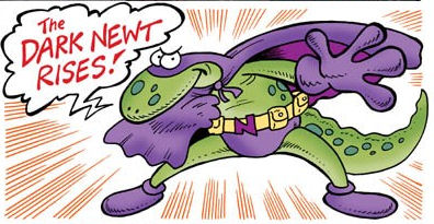 History: When another newt occupied his favourite floating twig and declared himself ruler of the pond, Bruce Newt decided to fight injustice, to become a symbol of vengeance for all oppressed newts, and the illogical urge to dress up in a mask and cape. Thus the Dark Newt was born!
