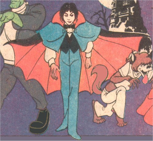 Drak Identity/Class: Vampire / Magically transformed human Occupation: Crimefighter Affiliations: The Drak Pack, Dracula Enemies: O.G.R.E. (Organization of Generally Rotten Endeavors - Dr.Dred, Vampira, Mummy Man, the Fly, the Toad) Known Relatives: Dracula (Great-uncle) Aliases: None Base of Operations: U.S.A. First Appearance: Drak Pack Episode #1 "Night of the Terbites" (Hanna-Barbera for CBS, September 6th 1980) Powers/Abilities: By clasping hands with Frankie and Howler and saying "Wacko", Drak could transform from a normal human youth into a young vampire, with all the requisite powers of same - able to turn into a bat or mist, hypnotise people, etc. History: Drak Jr wished to make up for the former villainy of his great-uncle Dracula, so he recruited two other descendants of monsters and formed the Drak Pack. Comments: Drak was voiced by Jerry Dexter |