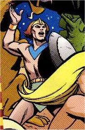 Powers/Abilities: At the peak of human physical achievement, Zandor is as strong as two normal men. Zandor uses his shield, which will return to him if thrown, and a slingshot, which can fire energized rocks, in battle. He is an excellent marksman with both items. He can also use his shield like a parachute if he falls from a great height.