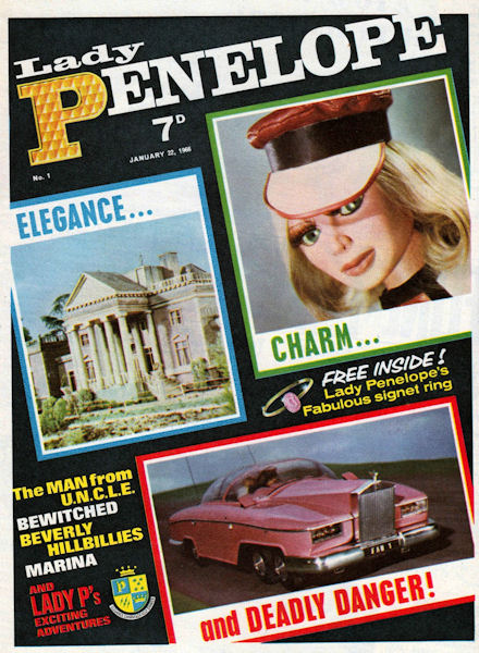 Comments: Lady Penelope was a British weekly comic for girls which ran from 1966 to 1969. The sister publication to TV Century 21, it was titled for its star, International Rescues' London agent Lady Penelope Creighton-Ward, from Gerry Anderson's Thunderbirds. Running alongside Lady Penelope's strip were strips featuring the Angels from Captain Scarlet and Marina from Stingray, both other Gerry Anderson shows, as well as strips based on US TV shows The Beverly Hillbillies, The Man from U.N.C.L.E., Bewitched and The Monkees. The first issue was dated 22 January 1966. The title changed to The New Lady Penelope with issue 53, back to Lady Penelope with issue 63 and then to Penelope from issue 123 onwards, as the comic dropped its connection to Gerry Anderson's shows. The run ended with issue 204, dated 13 December 1969, after which the title joined with Princess Tina.