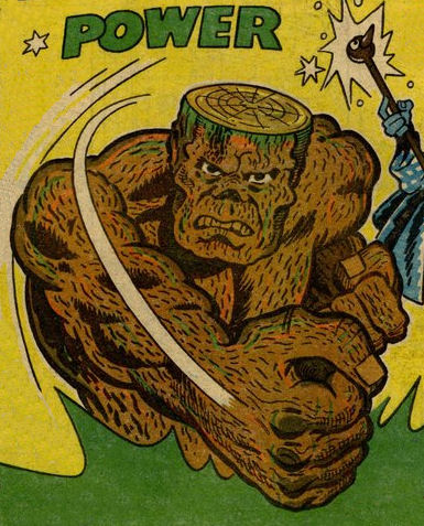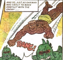 Powers/Abilities: Sam transforms into Oakman whenever any one of the group says or even writes the phrase Rings of Zorr. Oakman is superstrong and impervious to bullets. He can fly and is capable of going into outer space without a suit on, though the ability to survive in space is apparently down to a spell cast by Blue Wizard, rather than his own powers.