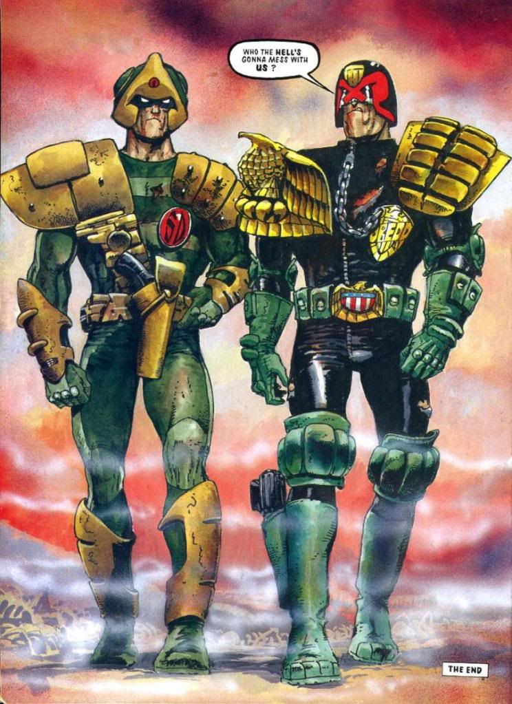 1. As well as having his own multiverse of related realities and sharing his world's timeline with a selection of other 2000A.D. strips, Judge Dredd has encountered both Friday (Rogue Trooper, in 2000 A.D. Prog 900's Judge Dredd strip, Casualties of War) and Johnny Alpha (Strontium Dog, initially in 2000 A.D. Annual 1991's Judge Dredd strip, Top Dog) when they time-travelled to his city (n.b. Dredd's world is Alpha's past, but Alpha's world may only be one of many possible futures for Dredd). |