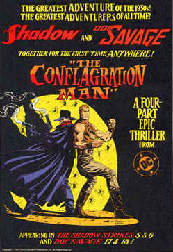 12. DC's version of Doc Savage met DC's version of the Shadow (as did the Dark Horse versions of both heroes), while a counterpart Doc Savage built the Rocketeer's jetpack. Meanwhile the Shadow has encountered the Avenger when both were at DC, Dynamite have teamed up the Green Hornet, Zorro, Black Bat, Shadow, Spider, Miss Fury, Black Terror and Green Lama, and Moonstone have published encounters between Phantom Detective, the Black Bat (again), Domino Lady, G-8 and Secret Agent X, plus a different crossover between Domino Lady and the Spider. All of which works to solidly tie together many of the major Pulp heroes. |