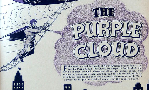 Powers/Abilities: The Purple Mask wields a gun that sprays "the Purple Cloud," a gas that dissolves all metals except silver, and which knocks out anyone it comes into contact with, leaving them with purple skin. He travels in an aerial ship resembling a flying saucer.