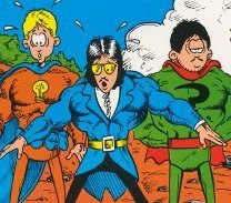 History: les Super-Zéros are four guys who discovered a magic teapot created by a genius ("made in Hong Kong" apparently). This device transforms them into superheroes - Love becomes Super-Vedette ("Super Star), Dan becomes Super-Limier("Super-Sleuthhound"?), Babe is Super-Jumbo(exactly the same after translation) and Carlos is Super-Génie (Super-Genius)