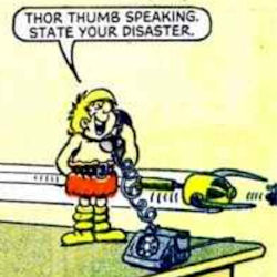 History: Thor Thumb appears to be a midget version of the ancient Norse God. He works as a superhero, reporting to the Professor, who in turn reports to the Prime Minister. While not overly bright, he is a dedicated hero and his perseverance usually wins through in the end.