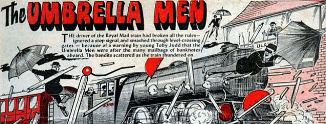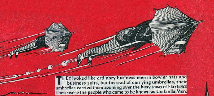 History: The Umbrella Men were a gang of thieves who dressed in business suits and bowler hats, and used jet-propelled umbrellas to fly and commit robberies. The handle could extended to allow the Umbrella Men to ride it like a stirrup. The umbrellas also included a motorised tip blade that could cut through steel like it was butter, and knockout gas that could be projected out of the handle.