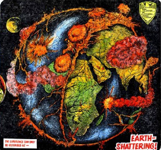 Usual Designator: None. Also known as: N.A. Multiverse: Judge Dredd Significant locals: None Significant locations: None Visited by: Mega-City One's TADs. Local travellers: None First appeared: The Apocalypse War, Judge Dredd, 2000 A.D. Prog 250 History: A peaceful and idyllic Earth that had enjoyed 1000 years of total peace. It was totally destroyed during the Apocalypse War when East-Meg One's Apocalypse Shield diverted Mega-City One's Total Annihilation Devices to it. The destruction of this world opened a dimension warp that dragged two alternate realities adjacent to it together, merging them in insane ways. Comments: Created by John Wagner and Alan Grant.