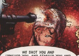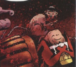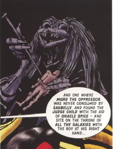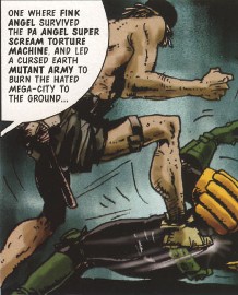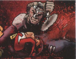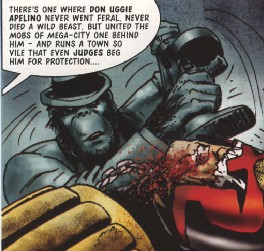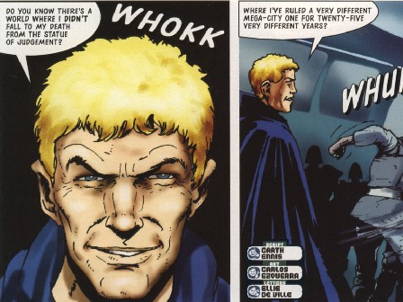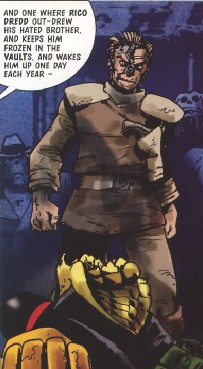Local travellers: Rico Dredd First appeared: Judge Dredd, 2000 A.D. Prog 1254 History: Rico Dredd defeated Dredd on his return from Titan. Rico let Dredd survive, freezing him so that once a year Rico could briefly revived Dredd to torture him. Comments: Created by Garth Ennis and Carlos Ezquerra. Cal says Rico outdrew Dredd, unlike his mainstream counterpart, but Rico's own dialogue suggests a slightly different reason for Rico winning; confident he was the faster draw, the mainstream Rico gave Dredd his gun back so they could draw against one another in a fair fight, but the alternate reality Rico wasn't so foolish. |