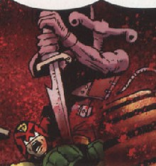 Usual Designator: None. Also known as: N.A. Multiverse: Judge Dredd Significant locals: Chief Judge Dread, Cassandra Anderson, Judge Mean Machine Angel, John "Giant" Clay, Judge Caligula Significant locations: Mega-City One Visited by: Judge Dredd Local travellers: Unknown First appeared: Dread Dominion (Virgin Books, 1994) History: Judge Dredd accepted the position of Chief Judge, but swiftly became corrupt, turning the city into his own private plaything and renaming himself Dread. Cassandra Anderson and John "Giant" Clay Jr became leaders of the resistance movement, while Judge Caligula is Governor of New Rome. Comments: Created by Stephen Marley. |