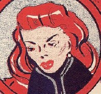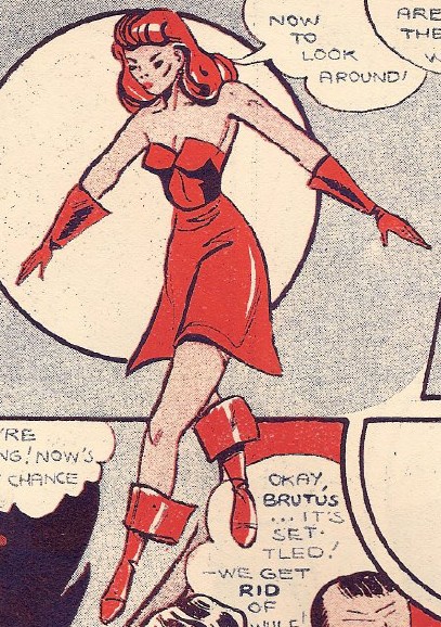 I'm informed she first appeared in the single issue of K.O. Knockout published by Cartoon Art Productions, but the sole sample I have of her strip, kindly supplied by Dennis Ray, clearly identifies itself as Acromaid Comics, a title not listed in Dennis Gifford's Complete Catalogue of British Comics, a title that generally lives up to its name. Whether this means Acromaid Comics was an insert or alternate title for K.O. Knockout, or that Acromaid Comics was simply an omission from Gifford's listings, remains a mystery.