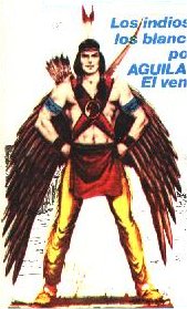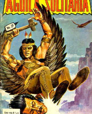 Thanks to Javier Delgado for most of the above information and additional images. He notes that "While Aguila Solitaria started as an Anti- western (75% of Mexican population is of native american origin), the adventures became more fantastic, resembling the adventures of his editorial brothers, like Arandu, Kaliman, and Orion. It ran for 759 numbers. Like most Mexican comics of the time, Aguila Solitaria was printed in Sepia in the interiors. Also was published in Colombia by Editora cinco." Javier has a forum dedicated to Kaliman, Aguila and other Mexican characters.