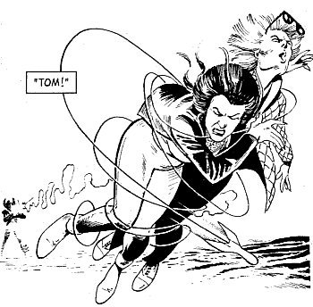 (Daredevils #4) Tom cradles Alison in his arms while watching Captain Britain pound on Slaymaster. He communicates telepathically with his lover, Betsy; Alison however has once more been rendered insensate by her ordeal.