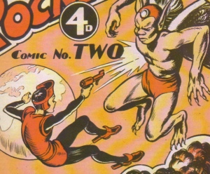 Powers/Abilities: Able to fly using "heel rockets", armed with "atom pellets", ray guns, and an iridium sword "that destroys all it touches".