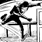Powers/Abilities: Both Billy and Katie have identical abilities. They are incredibly agile, able to leap superhuman distances (in one strip they launch themselves from swimming underwater like a pair of dolphins) and somersault and dodge around with parahuman grace. They appear to be somewhat stronger than average, as for a pair of pre-pubescent children they seem strong enough to fight adults, though how much stronger is unknown (Katie is strong enough to hold the weight of a falling child of her own size at the end of a rope without visible strain). They have excellent balance, running and jumping from one rooftop to another, and can climb sheer surfaces without difficulty. Presumably they also have above normal stamina - they seem to adventure all night and still manage to handle school without the slightest sign of being tired - more seriously they are able to swim great distances underwater without coming up for a breath while wearing leather catsuits and crash helmets. I guess they can handle extremes of temperature quite well, as they run around wearing skin-tight leather without getting overheated