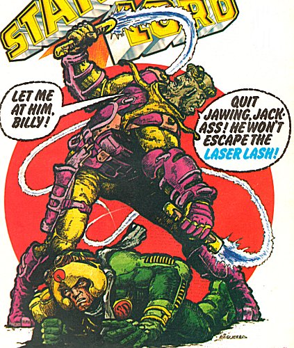 Billy Joe's men overpowered the two bounty hunters, and he challenged Alpha to a las-whip match to the death. Alpha, unused to the weapon, lost the duel, and was pronounced dead when his heart stopped. But he had fooled his opponent, as Alpha had trained himself to perform this trick as a last ditch gambit, and after Billy Joe and his gang departed, Johnny's partner Wulf revived him. While Alpha healed from his injuries, he also trained in the use of the las-whip under the tutelage of alien circus owner Jubal.