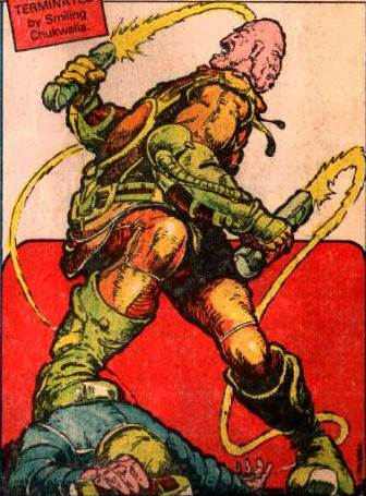 Powers/Abilities: Billy Joe was a champion las-whipper, and could skin a man alive with his weapon of choice. His mutation meant he had a face on either side of his head, so that it was impossible to catch him unawares.