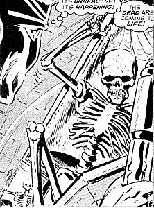 There was a crypt which belonged to Darkmoor Castle at the rear of the building. Within that mausoleum was a door which accessed a tunnel leading into the castle. However the Baron had placed a couple of skeleton's in the crypt who animated an attacked anyone trying to use that route, as Captain Britain discovered. Though the undead guardians shocked the hero, he made short work of them. - SSM&CBW #238/2 |