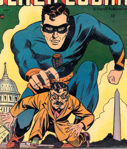 Powers/Abilities: Black Cobra's suit is made of a special plastic of his own invention, and is so bulletproof that he can take being shot without even being bruised through it. His boots contain powerful suction cups, allowing him to run up and down vertical walls with ease. He also drives a "super-car." Some part of becoming the Black Cobra involves a transformation, as on one occasion he finds himself unable to switch to his alter ego thanks to having been drugged.