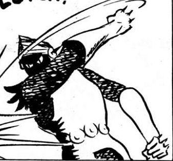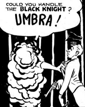 History: Young Bill was a boy who had somehow gained the power to transform into an armoured Black Knight by saying a magical word, Umbra. He and an adult companion became stranded on an island, but a passing ship saw their distress beacon and rescued them. However, the ship later ran aground thanks to a murderous wrecker, Grundy. Bill, his friend and the ship's captain were the only survivors. Grundy decided to keep them alive for a short time, planning some cruel sport with them, but while Grundy was overseeing the looting and his fellow prisoners were asleep, Bill transformed into the Black Knight, broke free, and captured the crooks.