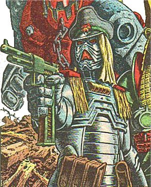 History: In the year 1999 Britain was invaded by the Volgs, once part of the Soviet Union, and now a powerful and warlike nation in their own right. The surprise attack allowed them to easily conquer the U.K., but staunch resistance led by men like Bill Savage eventually drove them back out again. Other nations were dragged into the conflict, until all of Europe was engulfed in war. Developments in robotics saw the first war droids, termed ABC Warriors (because they were immune to Atomic, Bacteriological and Chemical warfare), used by the west. It wasn't long before the Volgs followed suit, and introduced their own. One kind became known as The Straw Dogs, because they were experts in jungle warfare and terror tactics. Programmed for cruelty and treachery, they were led by General Blackblood, who derived his name from stories that he drank the oil of enemy robots.
