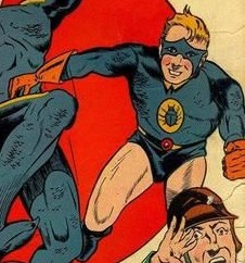 He designed a blue costume of bulletproof chainmail, and drove around in a souped-up roadster. He would play on criminals' fears by lowering beetles-on-a-string on them (pretty childish really) or flashing a beetle insignia on walls to frighten them. Since the Beetle soon gained a reputation for shooting first and killing enemies in cold blood, knowing he was around probably scared the beejesus out of most villains. His non-powered sidekick was Sparky.