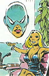 To the left is Zora Loftus, ironically pictured below her criminal alter-ego while appearing on the "People's Talking" show. What I want to know, and trying not to sound sexist, is how could the witnesses to Bluebird's crimes be unsure as to the gender of the thief? Take one look at Zora in that dress and you'll see what I mean. For the record, the other guest who is mentioned as appearing on the "People's Talking" chat show alongside Zora was Ben Grimm, the Thing.