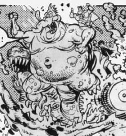 History: An alien survey ship gathering specimens of parasites from five galaxies collected Bonjo, smallest of his species, as one of their specimens. Unfortunately that ship subsequently crashed in China while trying to make an emergency landing. Thrown clear, Bonjo was the only survivor, and, upon discovering that on this new world he was a giant, the voracious alien went on a rampage, eating anything he could lay his hands on. Eventually however the mad scientist Dr. Lu-Ney bred Mach Aardvark, who ventured inside Bonjo and threw the monster's brain out his ear. Bonjo, at this point moving through the ocean, trod on his own brain and apparently died, sinking to the depths below.