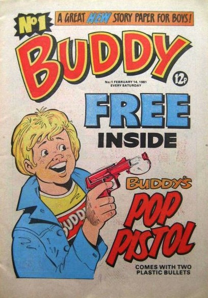 Comments: A weekly boys comic from DC Thomson, Buddy concentrated on adventure strips rather than humour strips (like its stablemates Beano and Dandy). The first issue was published on 14th February 1981 and included a free 'Pop Pistol with Two Bullets'. Buddy issue two came with a free Banshee wailer', while issue three included a free' Super Zoomer' a balloon that 'soars and swoops and loops the loop'. Though it was not uncommon for the occasional strip in one title to have originally appeared in another, defunct title, and very common for strips to transfer titles via a failing comic merging with a more successful one, Buddy was unusual in having an extremely high percentage of strips which had originated in other DC Thomson titles, suitably reimagined and updated, both from cancelled titles and from titles such as Beano which had included adventure strips in its earlier days but gradually phased them out on favour of humour strips. The stories in the first issue were 'Limp Along Leslie' (originally from Wizard), 'The Wolf of Kabul' (previously appearing in Hotspur), 'Deep Sea Danny's Iron Fish' (a reimagined version of the Beano's Iron Fish), 'Jonah - The Biggest Jinx on the seven Seas' (a rare Buddy humour strip, originally seen in Beano) and 'Billy the Cat' (a slightly older version of the character who used to appear in the Beano), plus new series (e.g. not having appeared in other titles beforehand) 'Tuffy - A Boy All Alone' (an orphan trying to survive on his own), 'Hammer' (a ninth century Briton fighting Vikings), and 'Boy on the Run' (a young boy fleeing the mysterious Man in Black). Later issues revived Beano's Q-Bikes and General Jumbo, Crunch's Starhawk, Bullet's Mice of Torbuk, and introduced new series Bushwacker (featuring a futuristic crimefighting vehicle), Jasper Sly (a Victorian-era villain), Hudfield's Hackers (a football strip), School of Soccer (another football strip), Tom Smith's Schooldays, Roul the Warrior (a Briton fighting the Romans), Maskface the Samurai (starring a masked warrior in ancient Japan), Frontline UK (an invasion story) and Klog (a humour strip featuring a Stone Age footballer). After a little over two years and 130 issues, Buddy ended on 6th August 1983.