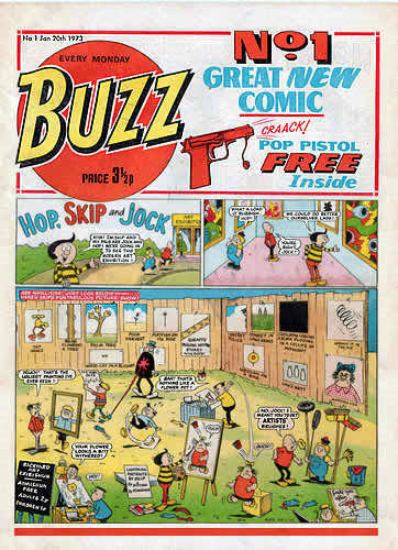 Comments: Buzz was a weekly anthology title launched by DC Thomson in 1973. Predominately a humour title, the cover stars were the trio of friends Hop, Skip and Jock, with other strips in the first issue including Big Bad Moggy (a malevolent cat who constantly tried to catch two unnamed birds), Big Fat Flo (the misadventures of a massively overweight girl), Billy the Kidder (a schoolboy whose propensity for telling tall tales constantly lands him in trouble), Calamity Kate (a tomboy whose clumsiness inevitably causes disaster all around her), Cookie (escapades of a nutty chef), Fred the Flop (the attempted crimes of an incompetent crook), Gus the Galoot (an incompetent cowboy), Harum-Scarem (the ongoing conflict between a thieving hare and the farmer's dog Scarem), Jimmy Jinx and What He Thinks (each week young Jimmy's good and bad sides, personified in Jimmy's mind as an angelic and devilish version of himself, argue and try to influence Jimmy to their way of thinking), Monty Moneybags (an amiable millionaire), Nero and Zero (Caesar's two nitwit bodyguards), Nobby (young and somewhat mischievous lad, who looks a lot like The Beezer's Ginger except for being blond haired), Olly's Occy (young Olly has an octopus for a friend), Skookum School (a standard gang of misbehaving schoolchildren in constant battle with their teacher), Tich and Snitch (an anthropomorphic mouse and elephant living together), The Twitz of the Ritz (the staff of the Ritz Hotel and their escapades), Wig and Wam (two warring Native Americans, one good and one bad), and Willie the Wizard (an incompetent young wizard in medieval times). Notable later additions to the comic included Spookum School (a spin-off from Skookum School, featuring four ghosts and their teacher haunting Skookum School at night), The Buzzies and the Fuzzies (two egg-shaped races, one smooth and one hairy, who constantly fight one another), Freeze! (an adventure strip where drilling for oil releases prehistoric bubbles of gas which freeze anything they make contact with), Sammy's Scribbles (the pictorial diary of a would-be artist), Sleep Ed (a boy who can and does fall asleep virtually anywhere) and Top Tec (a humorous detective).