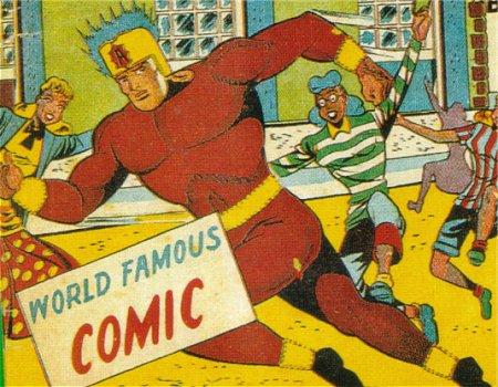 Powers/Abilities: Able to fly at incredible speeds, superhuman strength, and invulnerability. He can generate tremendous heat from his body, fire bolts of atomic energy from his hands, and has "super-sensitive atomic-radar powers" that allow him to detect and listen to radio transmissions. He can also exhale incredible blasts of air due to his atomically powerful lungs.