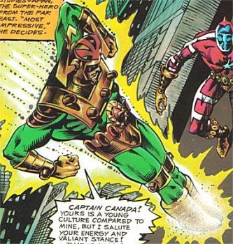History: Japan was Captain Canada's counterpart in his own country. He came to Montreal to warn the new hero of the impending fight with Sho-Gun, a giant robot employed by the Super-Mafia. Japan informed his new ally that he had been a hero for "hundreds of lifetimes", but he felt Captain Canada was still too weak to face the deadly robot, and counselled him to go to use the stone book Captain Newfoundland had provided Canada to enhance his powers, telling him to start with the most powerful chapter of all, "Love".