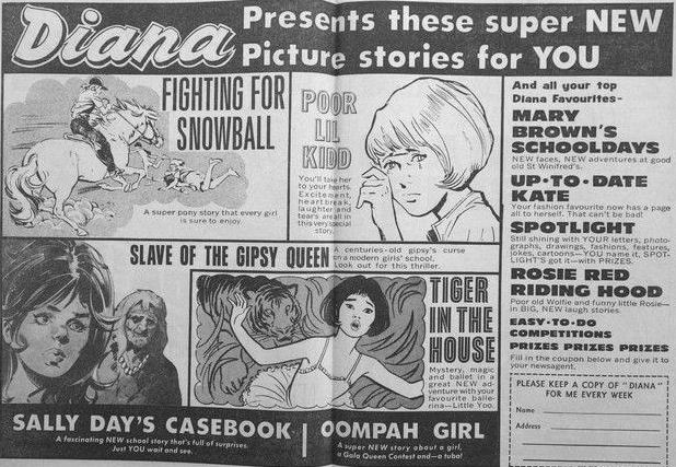 Strips: The Avengers (Steed and Peel version), The Girls from NOODLES, Mary Brown's Schooldays, Paula with the White Mask, The Black Nightingale, The Woman in White, Up-to-date Kate, Who Am I?, Lorna at Court, The Lonely Nightingale, Jenny's Country Cure, My Big Brother Marmaduke, Serena of the Silver Blades, Gobble Gobble Gertie, Search for the Snow White Stallions, Penelope, The Magic Mirror, The Swish Family Robinson, Jimmy Boy, Rosie Red Riding Hood, Our Gang, Poor Little Fella, Diana's Daydream, Hayley in the House of Fear, Kit and the Cats, Ballet with Captain Thunder, To Be a Beauty Queen, Starr of Wonderland, The Haunting of Helen, Wild Girl of the Amazon, Sadie Macbeth, Mandy the Thirteenth, Otter Girl, The Laughing Cats