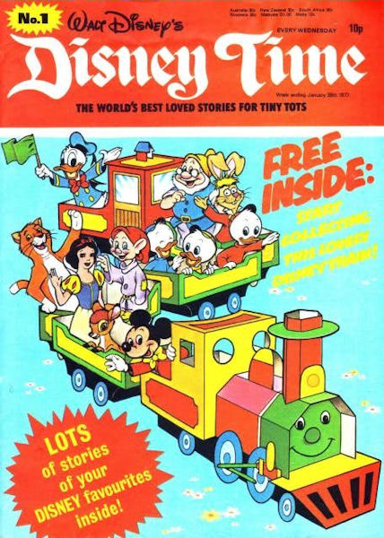 Comments: Disney Time was a licensed weekly Disney comic published in the U.K. by IPC. The first issue was cover dated 29th January 1977. It was cancelled after 21 issues on 18th June 1977 and merged with Mickey Mouse in Disneyland, which was renamed Mickey Mouse and Disney Time. There were two specials, a "Fun Time Special" and Holiday Special, and, despite the weekly title having such a brief life, 8 Disney Time Annuals.