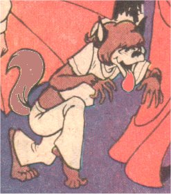 Identity/Class: Werewolf Occupation: Crimefighter Affiliations: Drak Pack, Dracula Enemies: O.G.R.E. (Organization of Generally Rotten Endeavors - Dr.Dred, Vampira, Mummy Man, the Fly, the Toad) Known Relatives: The Wolfman (unspecified relation) Aliases: None Base of Operations: U.S.A. First Appearance: Drak Pack Episode #1 "Night of the Terbites" (Hanna-Barbera for CBS, September 6th 1980) Powers/Abilities: By clasping hands with Frankie and Drak and saying "Wacko", Howler could transform from a normal human youth into a young werewolf, with all the requisite powers of same - enhanced senses and physical attributes, etc. Like the classic "Big Bad" wolf, Howler possessed tremendous lung power that could generate gale-force winds. History: A descendant/relation of the Wolfman, Frankie was recruited by Drak, another monster's descendant, to become a member of the crimefighting Drak Pack. Comments: Howler was voiced by Bill Callaway. Thanks to Abel DuSable for additional information about Howler. |