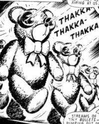 Powers/Abilities: Droll has at his command a series of mechanical killer toys. He is able to covert normal toys into killer ones almost instantaneously using special adaptor spheres he carries with him. Along with the standard array of army toys (tanks, soldiers, helicopters, etc) he also uses explosive clockwork mice and teddy bears with machine guns in their eyes.