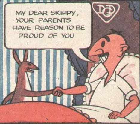 Skippy the Kangaroo - an apparently Belgian humour strip (reprint?) about an exceptionally smart kangaroo. The early installments star the hunter Sir Marlborough Mouseworthy, and Skippy doesn't turn up until issue #9. (Vol.1 #1-52) |