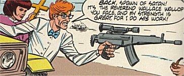 The Reverend Wallace Wallop and Polly May Wallop [#23]. A pair of TV evangelists with a difference - they really do believe in God and aren't in it for the money. Their ability to see through demonic illusions allowed them to see that the demon Bob was trying to trick them into running over the Badger and to perceive Bob as he truly was, and their holy water water pistols did the rest. |