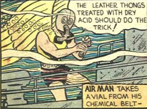 Powers/Abilities: Air Man's costume includes a pair of Helium-filled wings and a jet-pack which enable him to fly. He also carries chemicals and bombs on his belt. His boots have talons on them, and he carries an oxygen mask so he can operate underwater as easily as in the air - when he wishes to submerge, he lets water into his hollow wings to use as ballast.