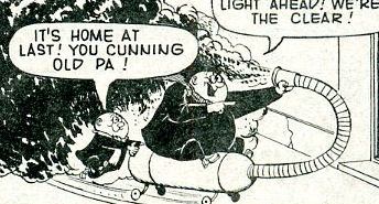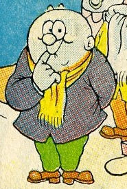 It's worth noting that Grimly's ambitions rapidly scaled down when he moved from being the antagonist in Eagle-Eye's strip to being the star of his own, with him going from a potential world-conqueror to a much more petty crook, albeit one with the odd large ambition. His sights went even lower when he joined the Shiver Givers, as he got caught stealing office stationery. Of course, if you feel inclined to explain such things, rather than just going with the flow of the humour strips, then maybe we were seeing his career in reverse.