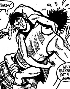 Thanks to Robert Kelly for providing information about the villains of the strip, the Swizzles. He notes that "I think you can guess what characters created by Galton and Simpson were the inspiration for the Swizzles! (TV characters Steptoe and Son, for anyone outside the U.K.) However, there was a bit of role reversal with the Swizzles. Here it was the father, Bert, seeking to better himself by acquiring Harker Hall. However, he was constantly being thwarted in his ambitions by his son Arnold's bungling and incompetence.