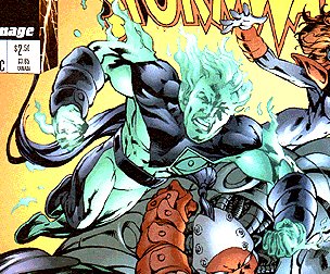 Much later he and Deathtrap had a rematch, which triggered a progression in Nigel's mutation. His body became pure energy, and began to lose cohesion, until team-mate and fellow energy being Fuji managed to help him, creating a containment suit similar to his own. Sadly Hellstrike eventually lost his life when a group of Alien xenomorphs invaded the Skywatch satellite; his suit was breached and he dissipated. Years later the Authority's Engineer resurrected him, and he joined the new StormWatch.