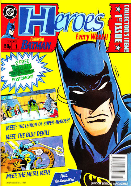 Comments: Weekly London Editions title reprinting DC stories for the British market. The featured strips were Brave and the Bold (starring Batman), Blue Devil, and Legion of Super-Heroes. The first three issues all had free postcards as gifts to entice in new readers. It was cancelled after 8 issues, an apparently abrupt decision since the eighth issue carried adverts for the ninth.