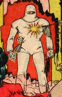 Afterwards Roy designed gloves which allowed him to contain his new power, and a costume to go with them, becoming the crimefighting Human Bomb. He worked alongside Hustace Throckmorton, who had a similar explosive power centred in his feet (gained through a lifesaving blood transfusion Roy gave him), and the teenage trio known as the Bombadiers. Towards the end of his recorded career, he ditched the white body stocking for a green business suit, fedora and leather gloves.