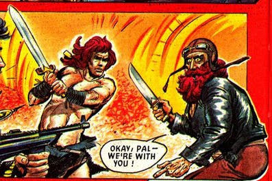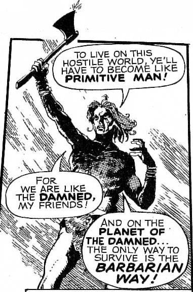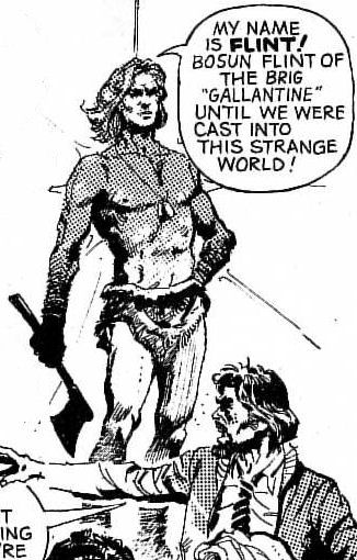 History: Jake Flint had been the bosun on the Gallantine, a British Brig (a sailing ship with two square masts), until it was sucked through a dimensional portal while sailing in the Bermuda Triangle circa the 1820s. The crew found themselves on an alien world which was soon dubbed "the Planet of the Damned" due to its hostile flora and fauna. Flint reinvented himself as a barbarian, allying himself with Sanctuary, a small outpost settled by other survivors, where the local plants had been tamed to serve man, and began trying to lead new arrivals there with the minimum of casualties.