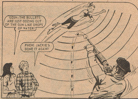 Comments: Jackie Flash is a reworking of Jack Flash, who originally appeared in the Beano. However, other than the name and basic abilities, she is a distinct character in her own right. Her strip (or the first installment of same, on the off chance it reappeared later) lasted from Mandy #347, cover dated 8th September 1973, to Mandy #360, cover dated 8th December 1973, skipping issue #355.
