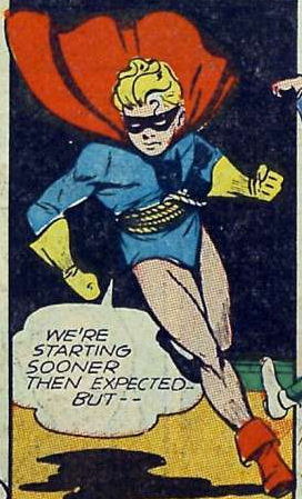 History: Darrel Creig was the heir to his late father's steel fortune, but his uncle, Molodon, who had been entrusted to be his guardian, secretly coveted the money for himself. He and the boy's guide, Travers, took the thirteen year old lad sight-seeing to the Statue of Liberty, then threw him from the top, but by sheer luck and coincidence, the vigilante 13 was also visiting the Statue that day, to intercept saboteurs who he had heard planned to blow it up. Spotting what was happening, he leapt down and caught the falling boy, saving his life. Together they captured Molodon and Travers as they tried to flee. Feeling he was all alone in the world now, Darrel asked his rescuer to take him on as his partner, becoming the costumed crimefighter Jinx.